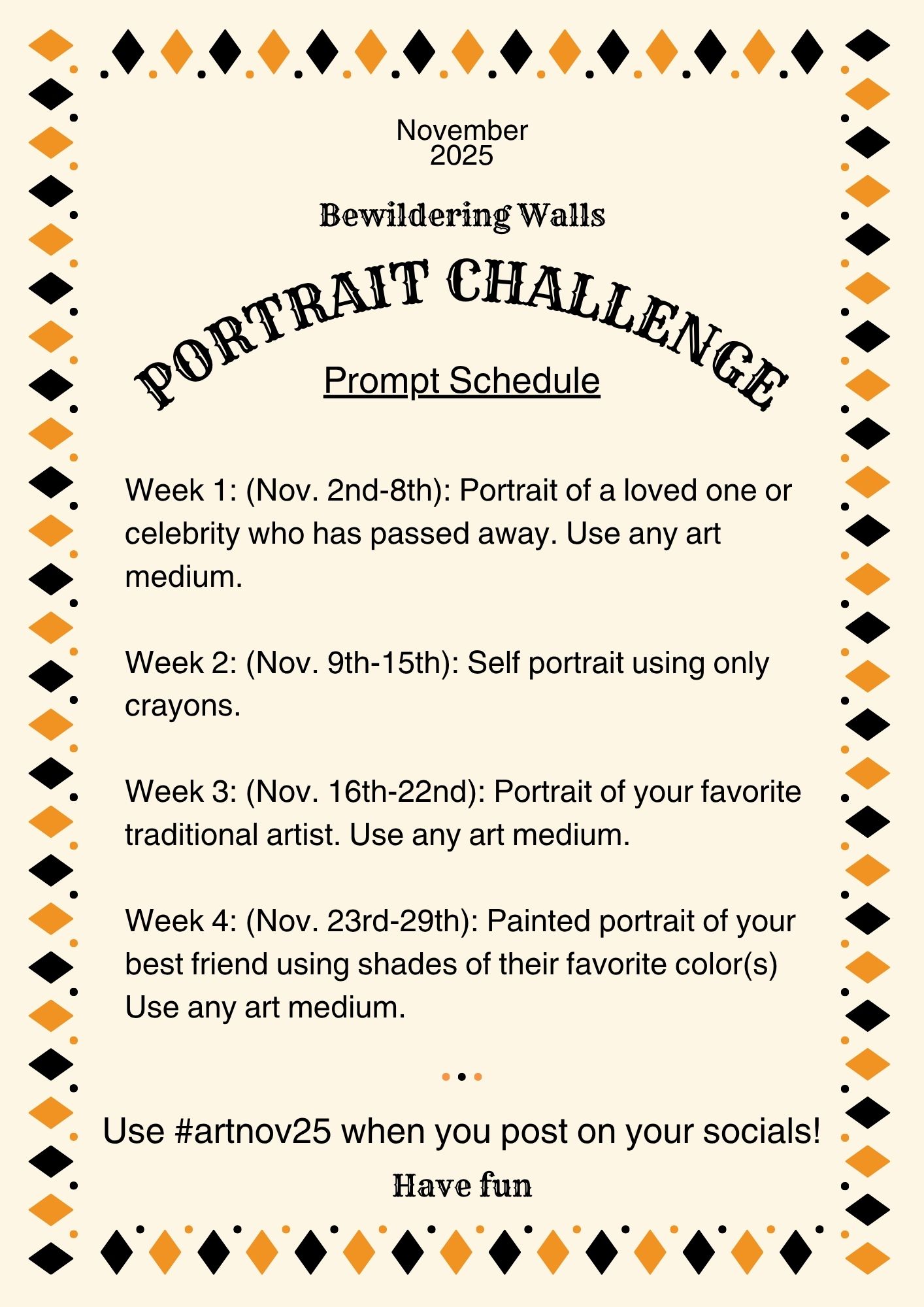 Well, people drawing skills that is! Join the fun this November during the Bewildering Walls Portrait Challenge. Each week we have a new prompt for you to try out. Post your drawings and paintings on your socials to share them with friends and family. Use hashtag #artnov15 in your post descriptions.
