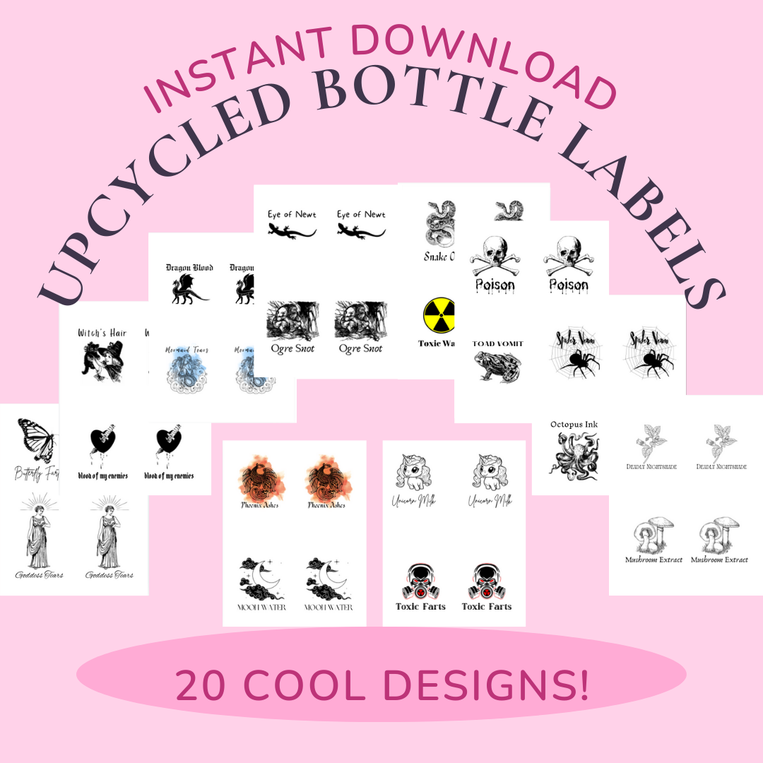 10 pages worth of different bottle labels for you to upcylce glass bottles into cool vases or decor. This pack inludes 2 of each design totally 20 different styles! Check bewildering Studio on YouTube for a step by step tutorial:)