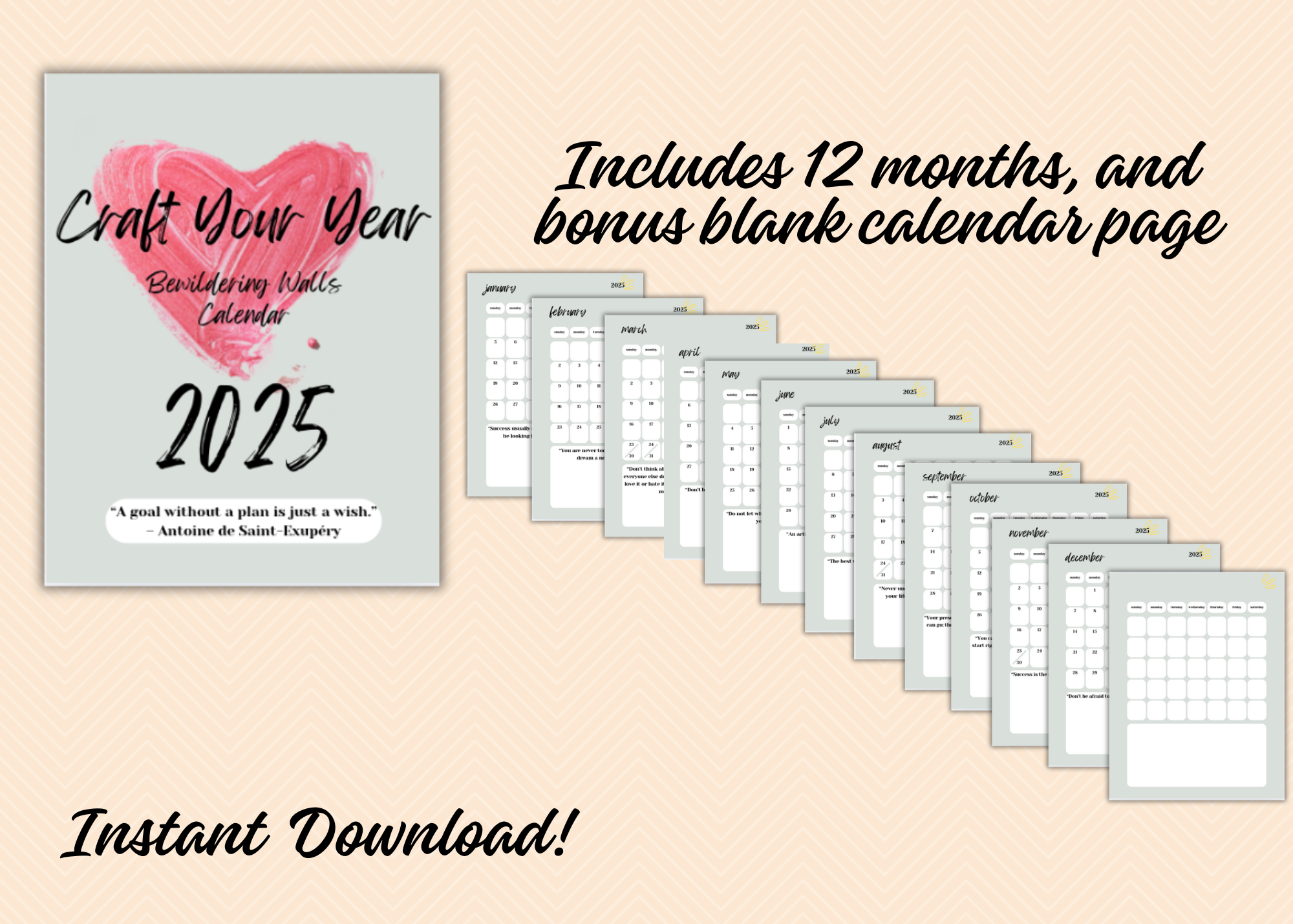The Craft Your Year Calendar had an inspiring quote for each month. It has and extra monthly calendar sheet that is blank, so you can write your own dates for future months.