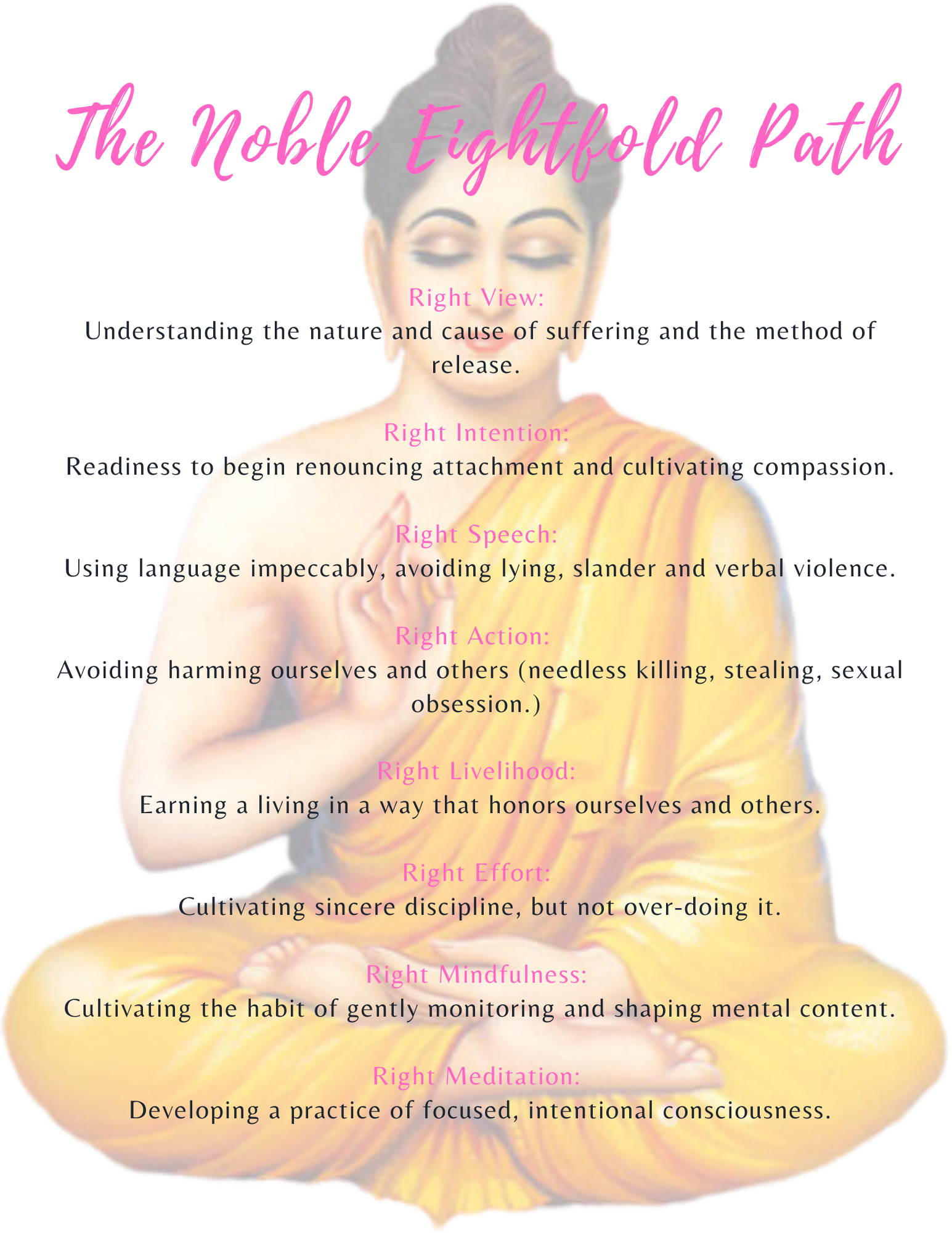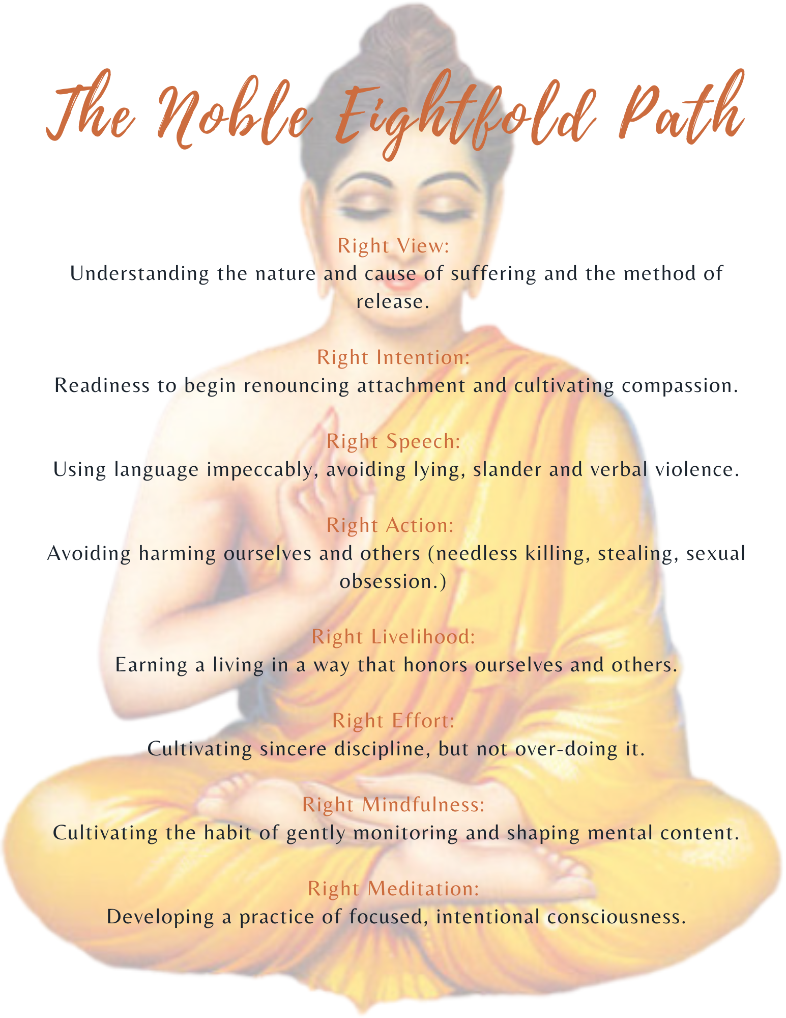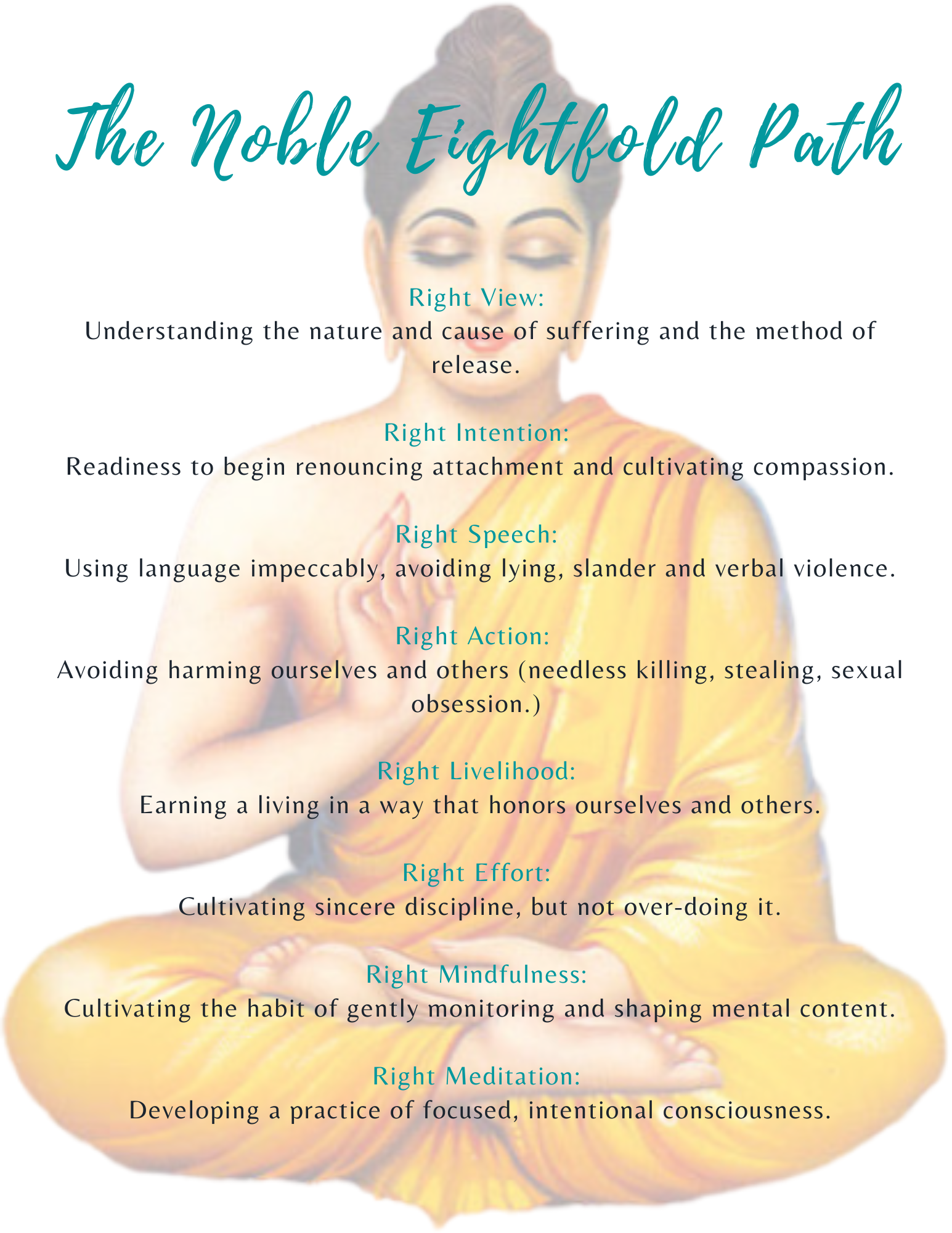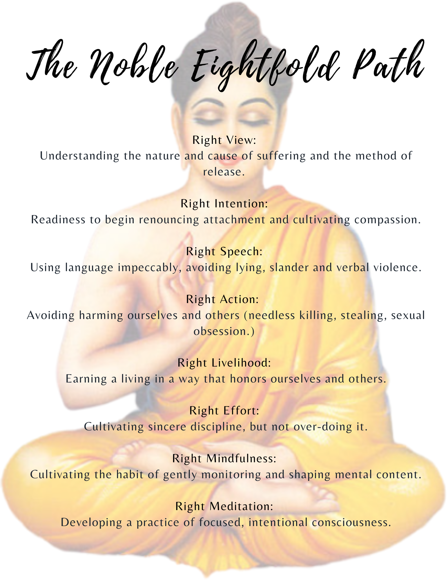 Decorate your home with this Buddhist Wall Art Print. It features a sitting Buddha and the Noble Eightfold Path is printed in a charming font.